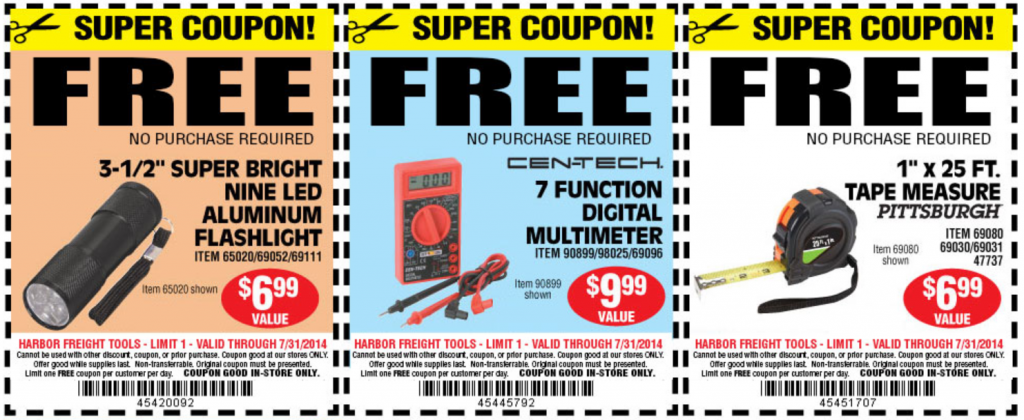 Print these coupons and take into a Harbor Freight for a free multimeter, free tape measure and free LED flashlight – only one coupon per person per day – valid through 7/31.